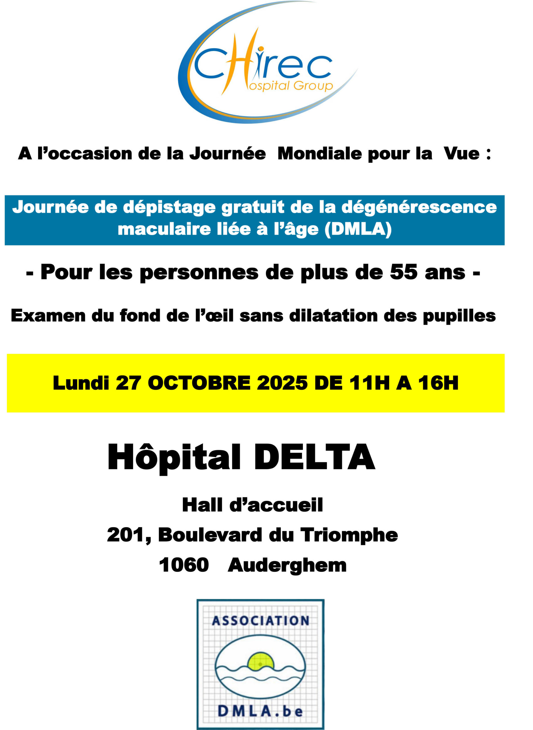 Dépistages gratuits de la DMLA Mercredi 15 octobre 2025 de 13h30 à 16h30 au CHU Brugmann, service d’ophtalmologie de Laeken Lundi 27 octobre 2025 de 11 h à 16 h au CHIREC- Delta dans l’atrium du site Delta 201 Bld du triomphe à Auderghem